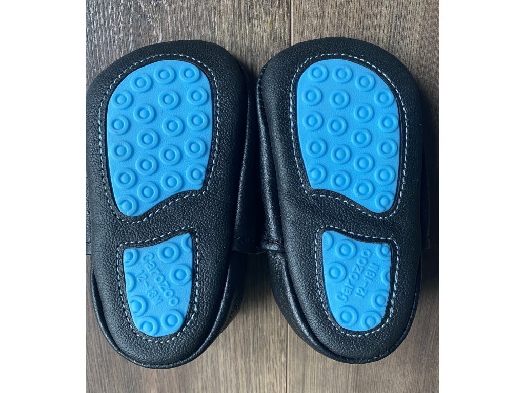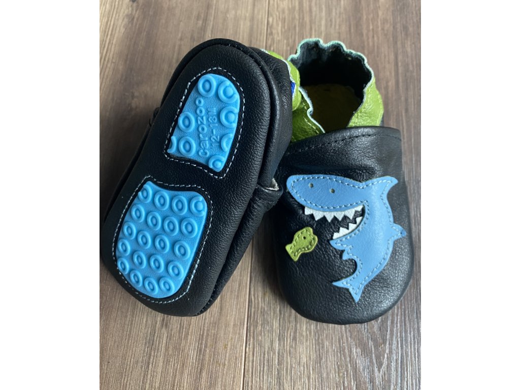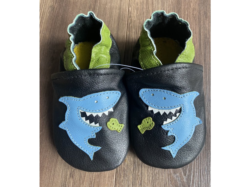 Cápás fekete kinti/benti puhatalpú babacipő – strapabíróbb prémium bőrt és csúszásmentes gumitalpat kombinálja, ideális kültéri és beltéri használatra is. Praktikus választás aktív kisgyermekeknek már 6 hónapos kortól 4 éves korig.
