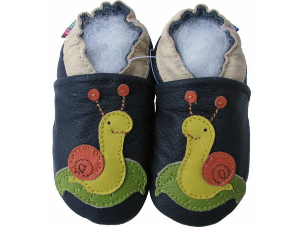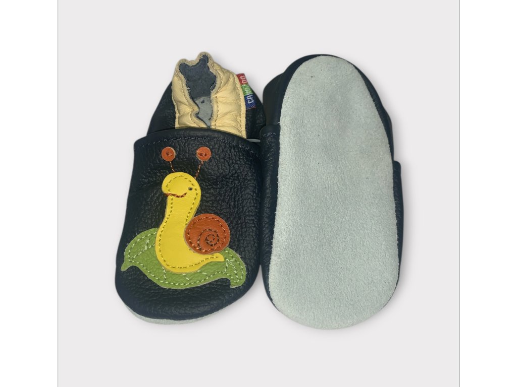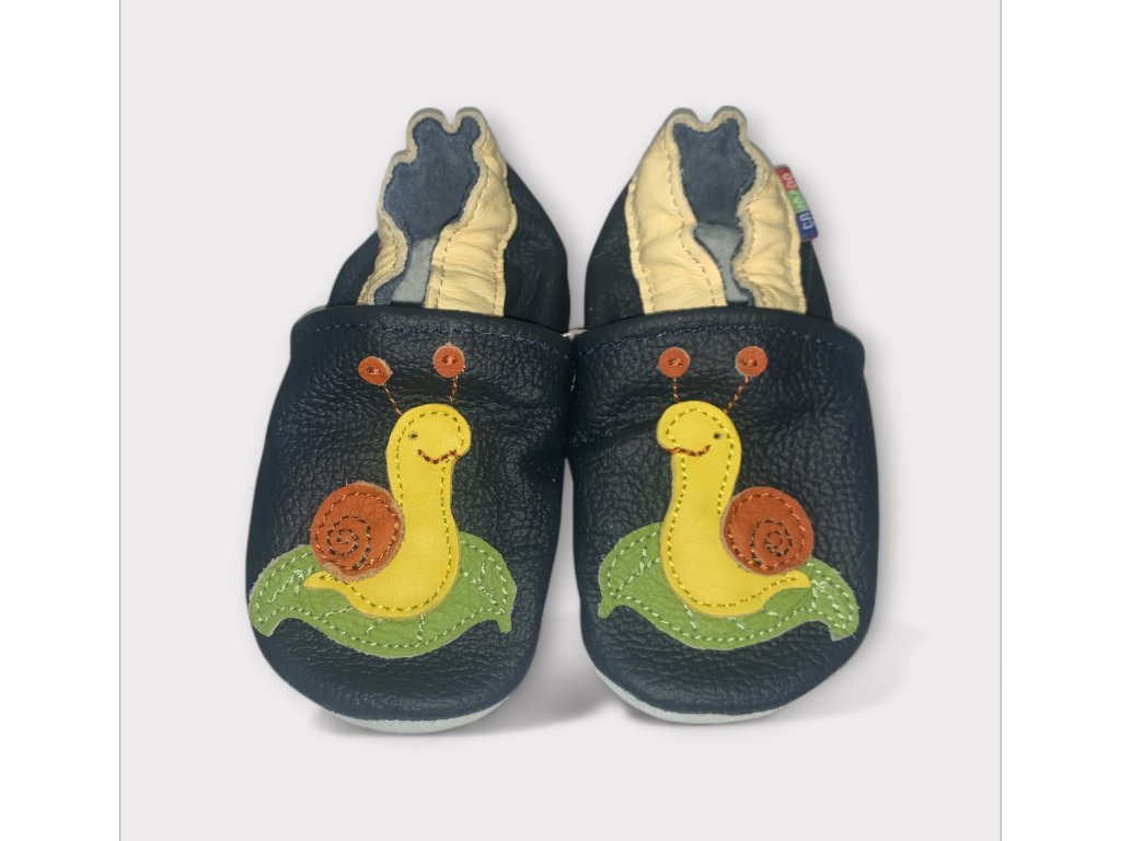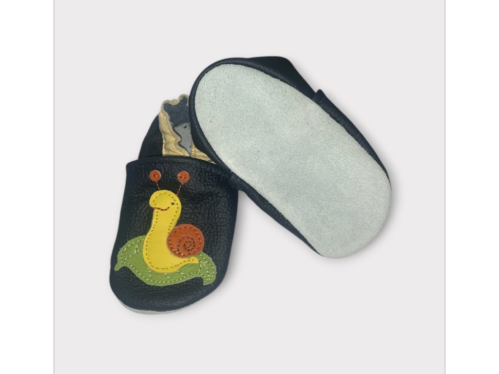 Aranyos csiga mintás sötétkék puhatalpú babacipő valódi bőrből – csúszásmentes velúr bőrtalppal és gumírozott bokarésszel, ideális benti használatra a járni tanuló babáknak.
