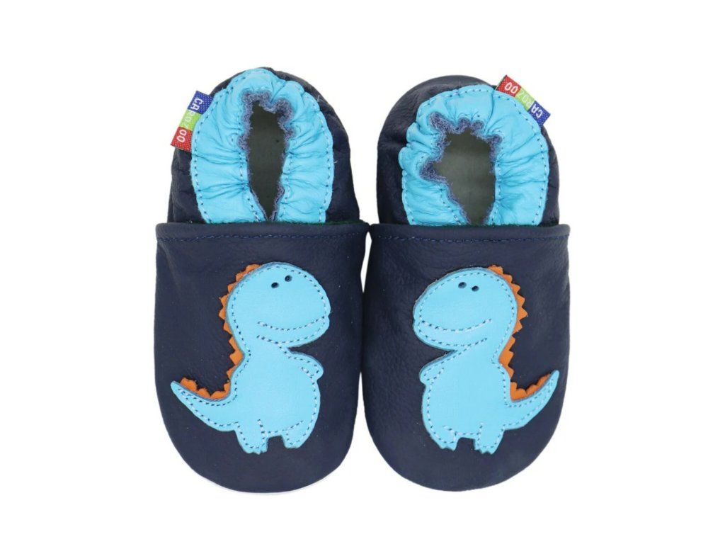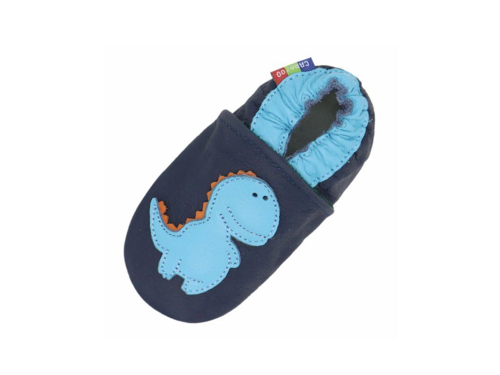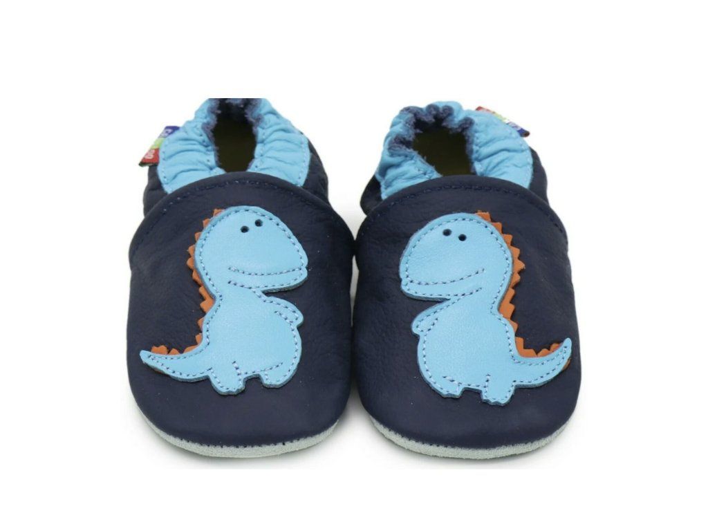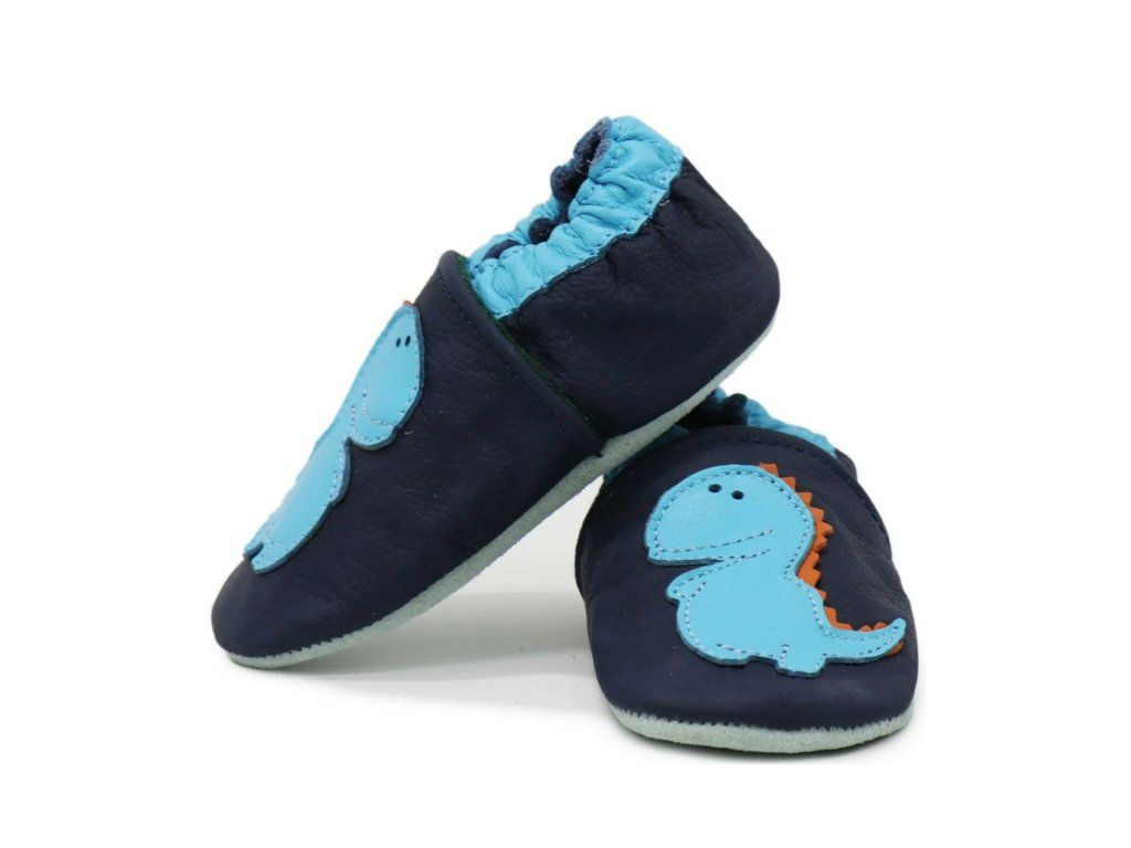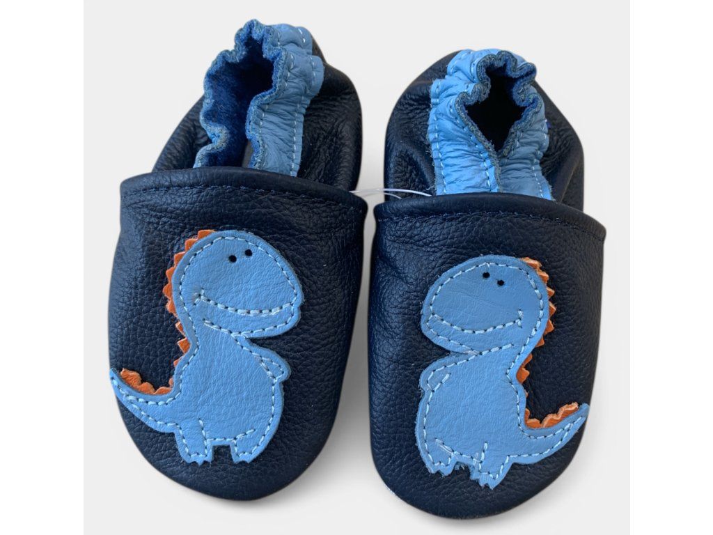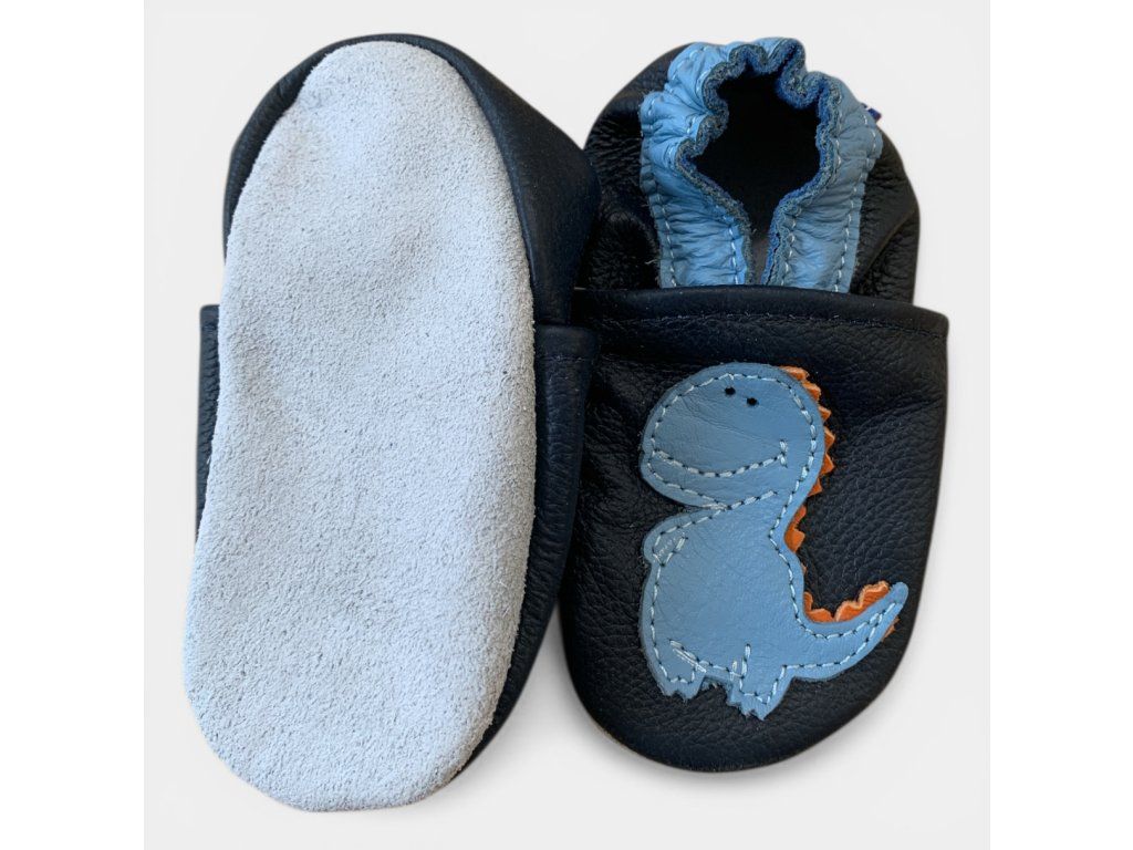Aranyos dinoszaurusz mintás sötétkék puhatalpú babacipő valódi bőrből – csúszásmentes velúr bőrtalppal és gumírozott bokarésszel, ideális benti használatra a járni tanuló babáknak.