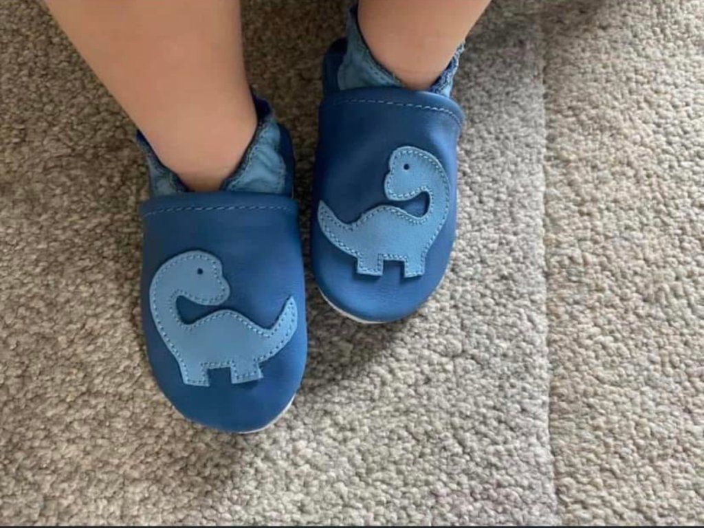 Vidám világoskék puhatalpú babacipő dinoszauruszos mintával – 100 % prémium puha bőrből, csúszásmentes velúr talppal és gumírozott bokarésszel, ideális beltéri használatra az első tipegő lépésekhez is.
