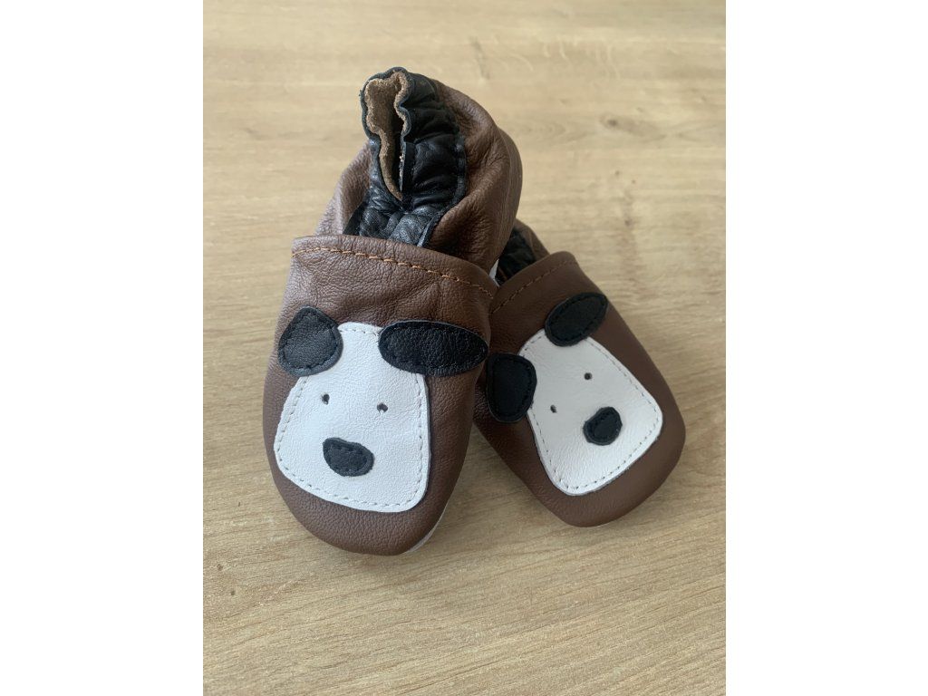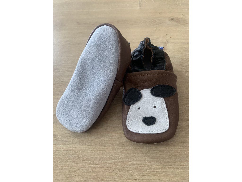 Barna, puha bőrből készült puhatalpú babacipő aranyos kutyus mintával. Kényelmes, hajlékony kialakítása és csúszásmentes velúr talpa ideálissá teszi az első lépésekhez és benti használatra.