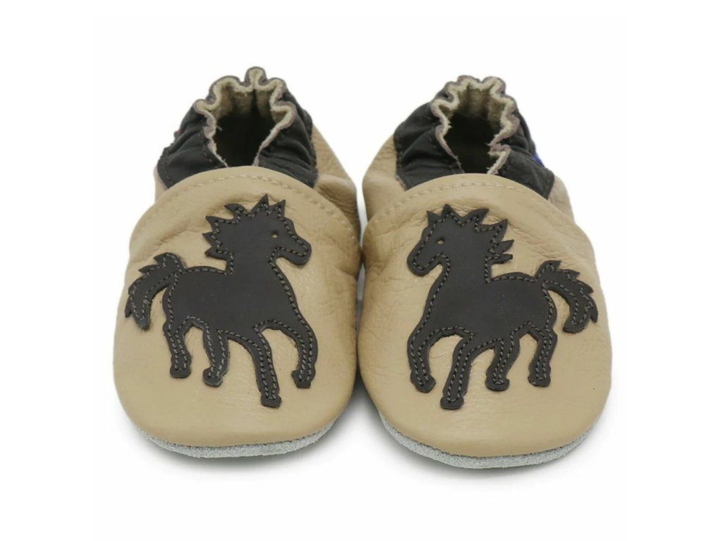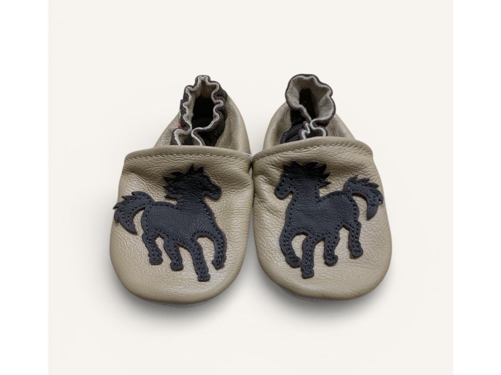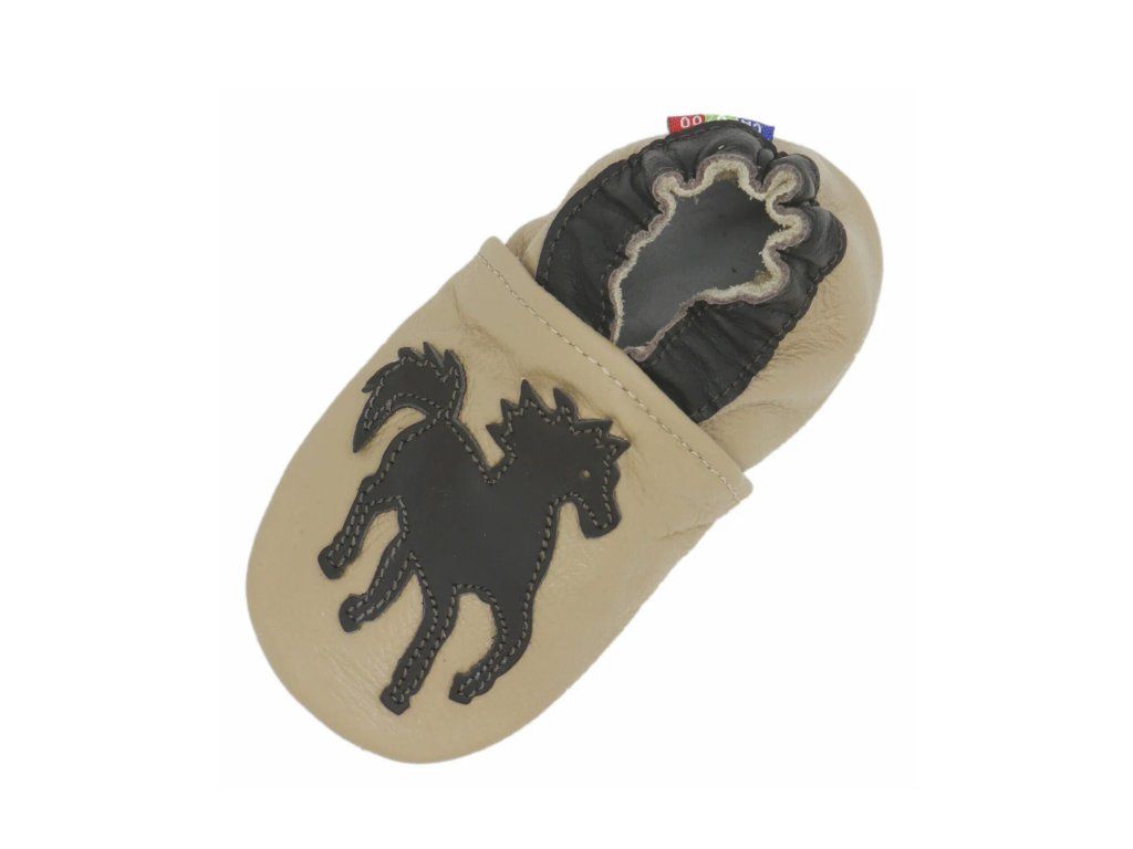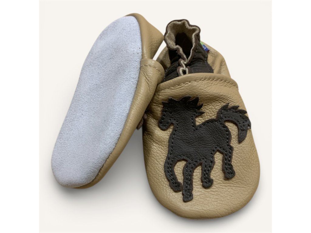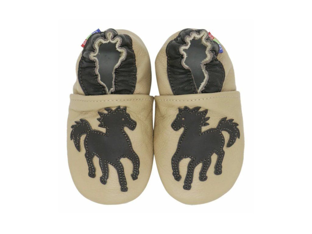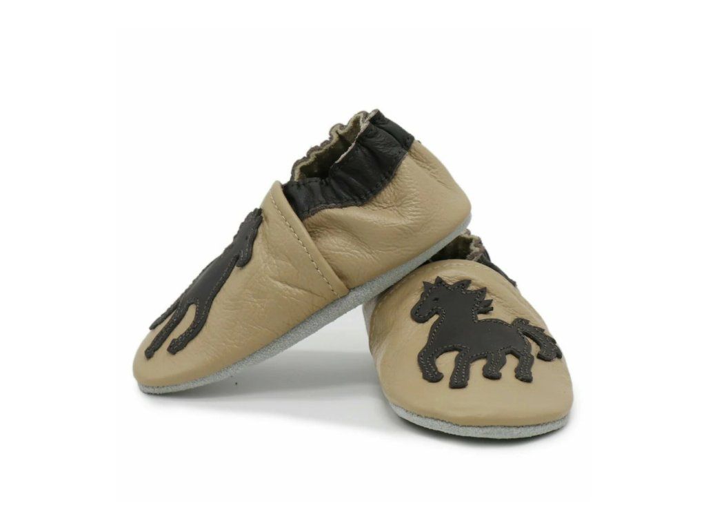 Elegáns lovas mintás bézs puhatalpú babacipő valódi bőrből – csúszásmentes velúr talppal és gumírozott bokarésszel, ideális benti használatra és az első lépésekhez.