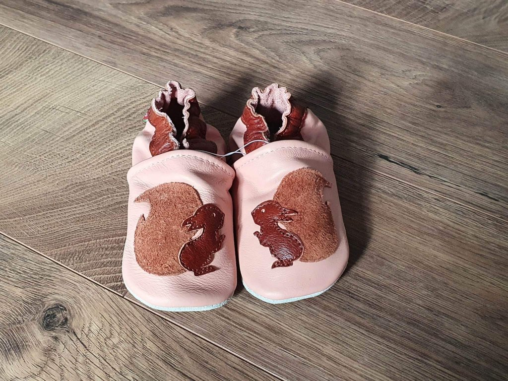 Aranyos mókusos mintájú rózsaszín puhatalpú babacipő valódi bőrből – csúszásmentes velúrtalppal és gumírozott bokarésszel, ideális benti használatra a járni tanuló babáknak.