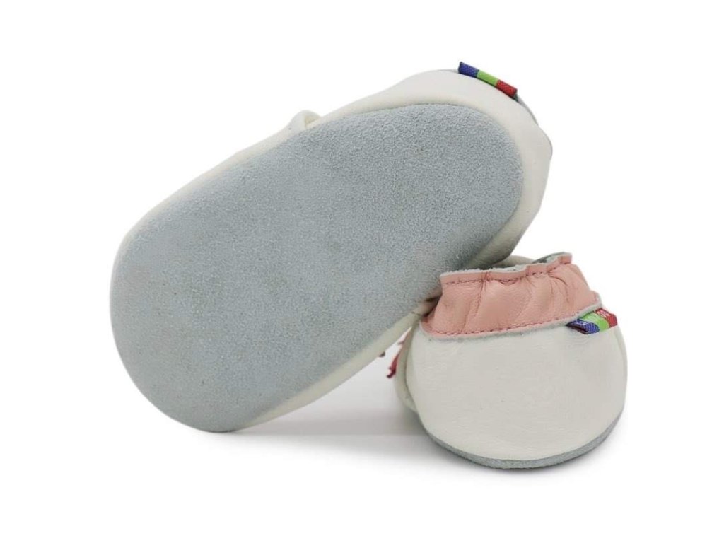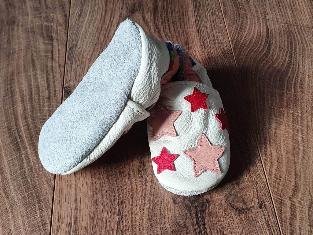 Fehér színű puhatalpú babacipő rózsaszín csillagmintával – valódi bőrből, csúszásmentes velúr talppal és gumírozott bokarésszel, ideális beltéri használatra a járni tanuló kicsiknek.